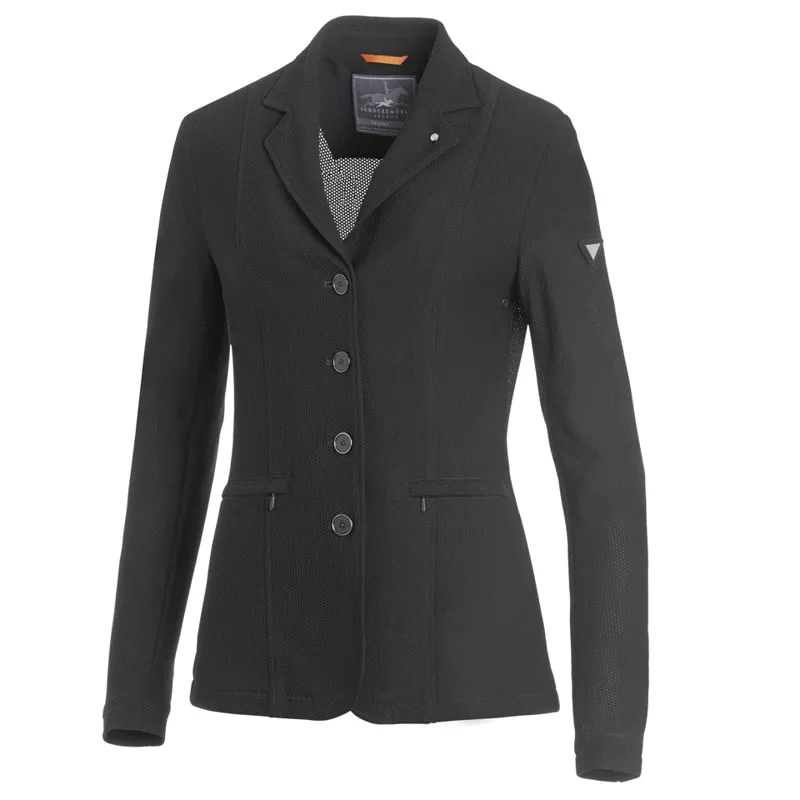 The Air Cool ladies show jacket by Schockemöhle Sports ensures a sporty andelegant appearance at your next horse show. With its fitted shape anddecorative dividing seams at the front, this show jacket does not onlylook great, but is also very breathable thanks to the airy mesh fabric.Two splits provide freedom of movement in the saddle. Thanks toventilation eyelets under the sleeves the jacket is also pleasant to weareven on warmer days.