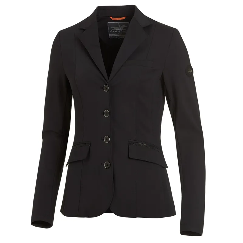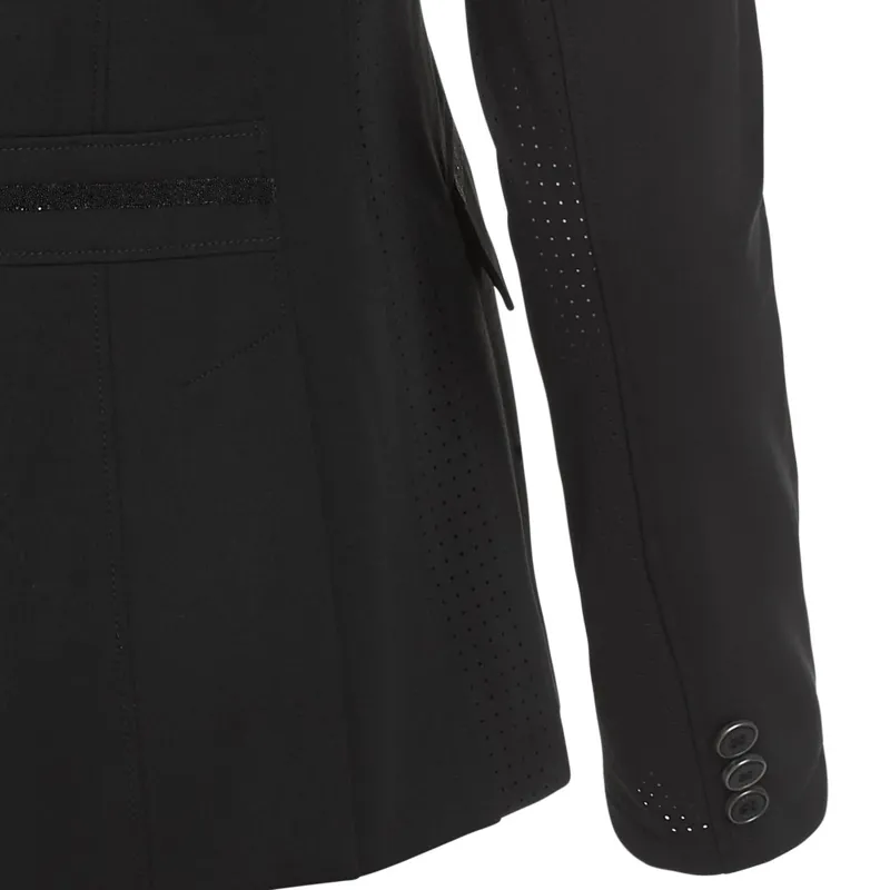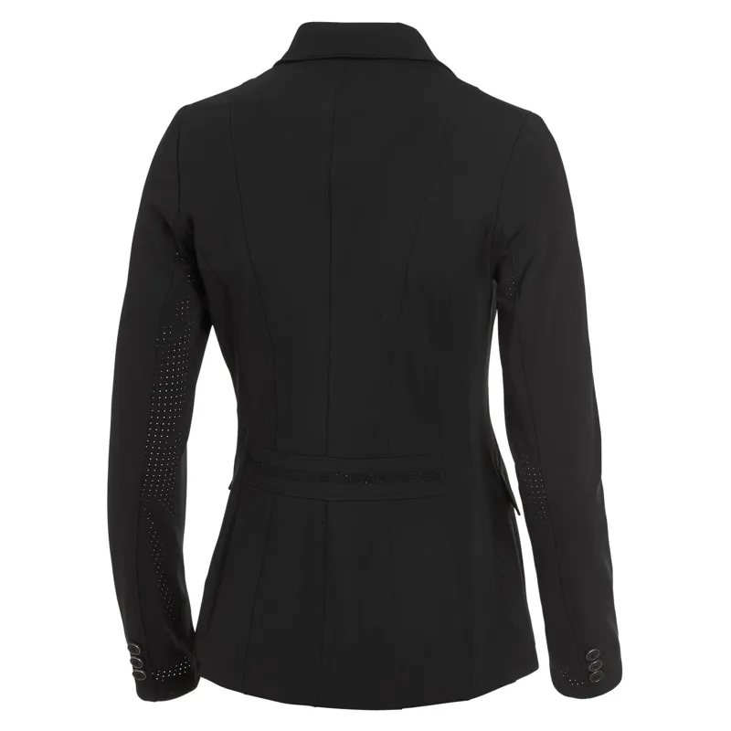 The ladies’ jacket Amelie Style by Schockemöhle Sports won’t let you down atyour big moment in the dressage arena or showjumping course! With itsclose-to-body shape, flattering dividing seams and shiny crystal meshdecorations at the pockets and back strap, it creates a sporty-elegantlook. The side panels and the lower sleeves are perforated – thereforethis functional jacket is especially breathable and also offers a lot offreedom of movement thanks to the slits in the back and the stretchfabric. And if you still work up a sweat, the functional material isreally fast-drying. Particularly practical: the jacket is completelycrease-free and can be put on or taken off very quickly thanks to aconcealed zipper, even while being on a horse.