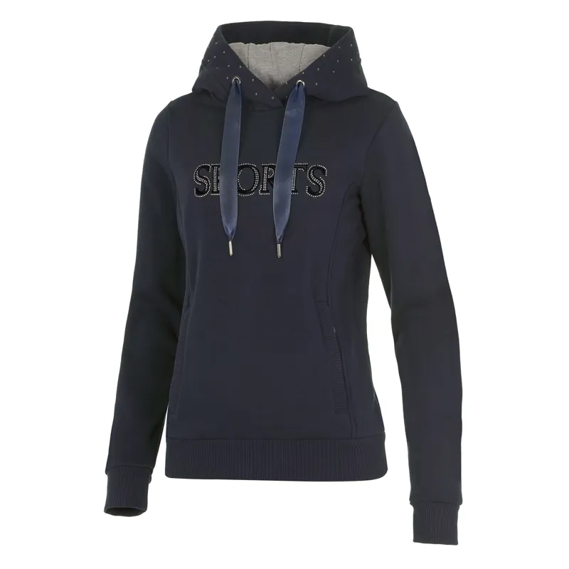 Warm ladies´ hoodie | fitted shape | zip pockets with logo zip | flock print with rhinestones on the front | hood inside with jersey and decorative ribbon | hood can be fixed | rhinestone horse on the sleeve
