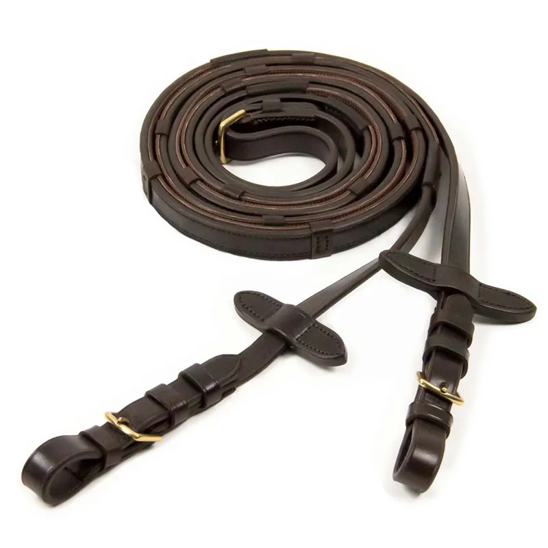 Premium BRIDLE REINS out of leather with incorporated leather bars, traditional buckles and reins stops. Exceptionally slip-proof due to the rubberised back.