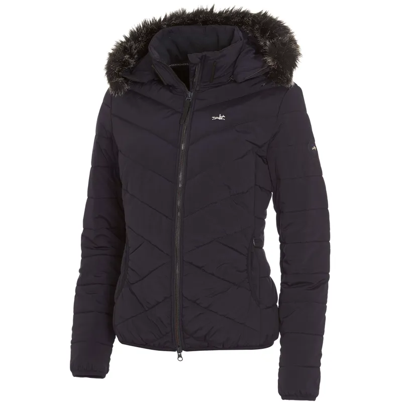 Comfortable quilted ladies‘ jacket with Dupont filling | water repellent | flattering quilting design | fitted shape | removable hood with faux fur and print | rib knit at the inner side of the collar | elastic binding at sleeve and bottom hem | unvisible zipper pockets in the dividing seam | logo rubber badge at the left sleeve | logo embroidery on chest