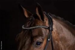 The Westminster round-stitched bridle from Schockemöhle Sports gives everyhorse a particularly elegant look with maximum wearing comfort. Theinnovative headpiece optimally positions the straps of the cheek piecesand noseband, and the bridle can be individually fitted in the neck area.The anatomically shaped special noseband made of ecological leather hassmall, padded D-rings. The buckling of the bridle under the head is paddedby a soft pad. The Westminster bridle is rounded off by the curvedbrowband with large crystals.